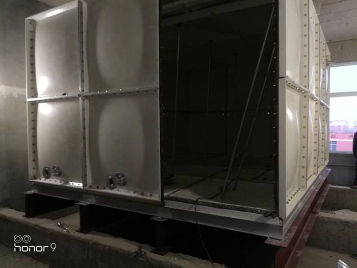 玻璃鋼橡塑保溫水箱條形基礎上又安放了一層工字鋼(根據(jù)自己的實際要求添加),焊接完槽鋼底座后依次把水箱底板擺放在槽鋼上。